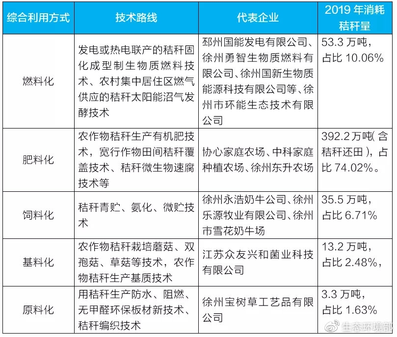 徐州市結(jié)合自身農(nóng)業(yè)生產(chǎn)和農(nóng)業(yè)固體廢物產(chǎn)生特點(diǎn),依托完備的秸稈收儲(chǔ)運(yùn)體系,積極探索秸稈肥料化、燃料化、飼料化、基料化、原料化利用路徑,形成成熟穩(wěn)定的多元化市場模式。主要技術(shù)路線、代表企業(yè)及消耗秸稈量見表1。