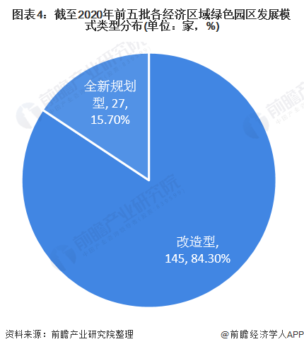 從綠色產(chǎn)業(yè)園區(qū)發(fā)展模式類型分布來看,我國綠色產(chǎn)業(yè)園區(qū)目前仍以原有園區(qū)改造型為主,全新規(guī)劃型占比較少,172家國家級(jí)綠色園區(qū)中改造型綠色園區(qū)為145家,占比達(dá)84.3%,全新規(guī)劃型綠色園區(qū)為27家,占比為15.7%。