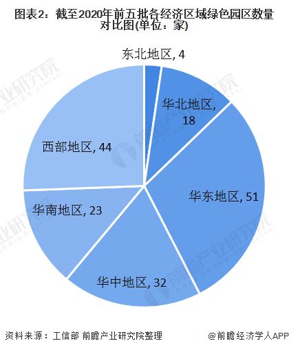 全國172家綠色園區(qū)有4家分布在東北地區(qū),其余較均勻的分布在全國的華北、華東、華中、華南和西部地區(qū),其中華北地區(qū)有18家,華東有51家,華中有32家,華南有23家,西部有44家。
