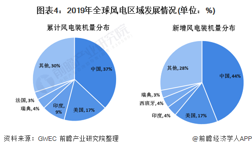 根據(jù)全球風能理事會(GWEC)發(fā)布的《全球風能報告2019》公布的數(shù)據(jù)顯示,2019年中國風電累計裝機量占全球的比重達37%,較2017年提高了19個百分點,新增風電裝機量排名全球第一,2019年中國新增風電裝機量占全球新增風電裝機量的比重達44%。中國已經(jīng)成為全球主要的風電市場。