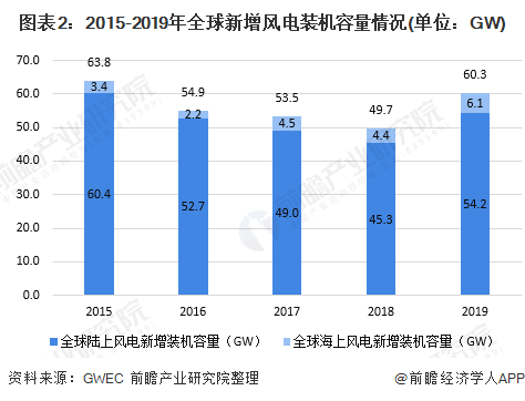 根據(jù)全球風能理事會(GWEC)發(fā)布的《全球風能報告2019》公布的數(shù)據(jù)顯示,2019年全球風電新增裝機容量為60.4GW,同比增長19%,其中陸上新增風電裝機容量54.3GW,海上新增風電裝機容量6.1GW。