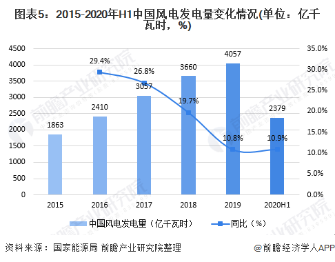 近年來,我國裝機容量的大幅度攀升帶動了發(fā)電量的高速增長。2019年,中國風電發(fā)電大幅增長到4057億千瓦時,同比增長10.85%;2020年上半年,全國風電發(fā)電量為2379億千瓦時,同比增長10.9%。