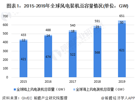 近年來,風力發(fā)電作為清潔能源備受全球各國關注,全球風力發(fā)電規(guī)模穩(wěn)步增長,根據(jù)全球風能理事會(GWEC)發(fā)布的《全球風能報告2019》公布的數(shù)據(jù)顯示,2019年全球風電裝機總容量為651GW,同比增長12%,其中陸上風電裝機容量621GW,海上風電裝機容量30GW??傮w來說,目前全球風力發(fā)電以陸上風力發(fā)電為主。