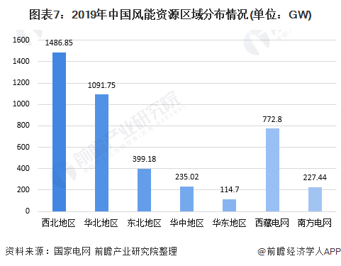 由于受地域和氣候的影響,我國風能資源在地理分布上差異較大,風能資源較多分布在西北、華北和東北地區(qū),2019年我國西北地區(qū)風電總儲量達1486.85GW,是風電資源儲量最大的地區(qū)。