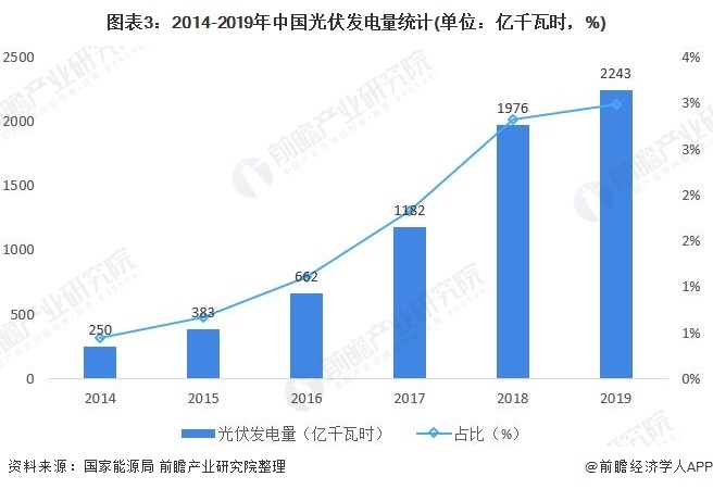從我國光伏發(fā)電量上看,2014以來,中國光伏發(fā)電量呈逐年上升趨勢,占總發(fā)電量比重逐年上升。2019年,全國光伏發(fā)電量2243億千瓦時(shí),同比增長13.3%,約占總發(fā)電量的3%。
