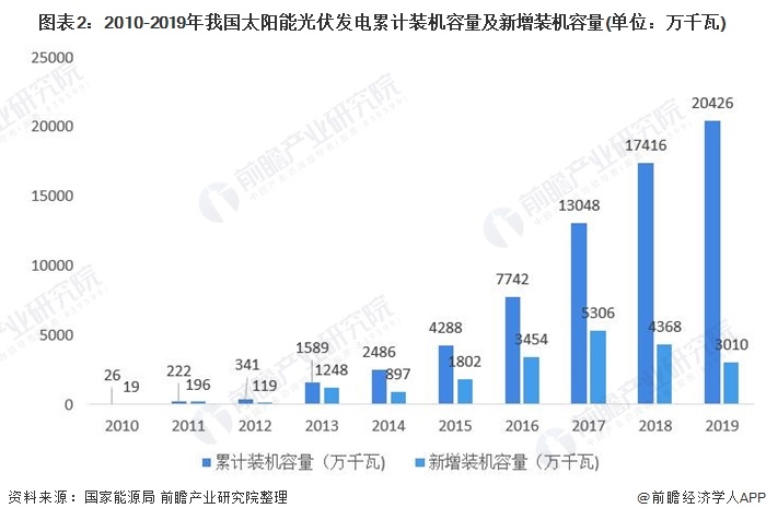 總的來看,我國太陽能光伏裝機(jī)容量增長速度趨緩。2019年,我國光伏發(fā)電新增裝機(jī)3010萬千瓦,同比下降31.09%,截至2019年底,全國光伏發(fā)電裝機(jī)容量達(dá)到20426萬千瓦。