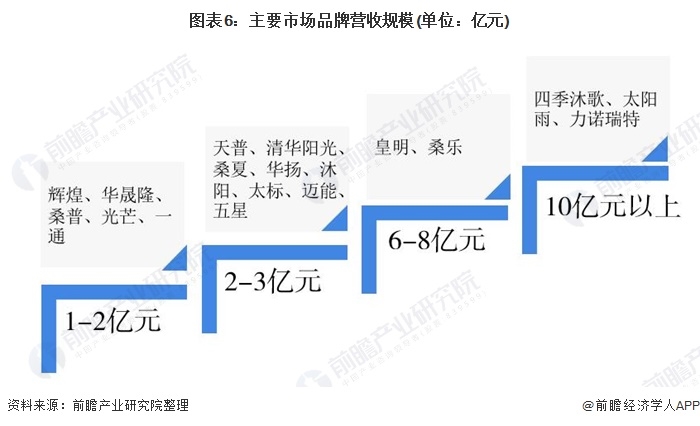 隨著大批太陽能企業(yè)的相繼倒閉和退出,太陽能熱水器市場份額進(jìn)一步向大中品牌靠攏,品牌格局日漸明晰。目前,我國太陽能熱水器企業(yè)逐步形成四個(gè)梯隊(duì),其中,日出東方旗下?lián)碛刑栍旰退募俱甯鑳纱笃放埔约傲χZ瑞特等三家太陽能熱水器代表企業(yè)處于第一梯隊(duì),營收規(guī)模均達(dá)10億元以上。