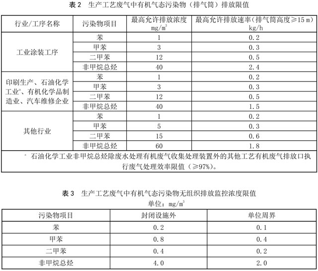 5.2.2 生產(chǎn)工藝廢氣中有機(jī)氣態(tài)污染物排氣筒、無組織排放監(jiān)控濃度限值分別按表2、表3的規(guī)定執(zhí)行。