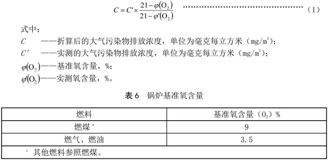 鍋爐和生活垃圾焚燒爐煙氣中二氧化硫、氮氧化物、顆粒物監(jiān)測(cè)時(shí),應(yīng)同時(shí)監(jiān)測(cè)煙氣氧含量,并按公式(1)換算為基準(zhǔn)氧含量排放濃度,以此作為排放是否達(dá)標(biāo)的判斷依據(jù)。若國(guó)家相關(guān)標(biāo)準(zhǔn)對(duì)鍋爐基準(zhǔn)氧含量或基準(zhǔn)排氣量有規(guī)定的,按照國(guó)家相關(guān)標(biāo)準(zhǔn)的規(guī)定執(zhí)行;若沒有規(guī)定的,基準(zhǔn)氧含量按表6的規(guī)定執(zhí)行。生活垃圾焚燒爐基準(zhǔn)氧含量按11%執(zhí)行。