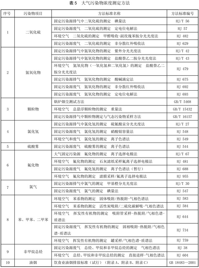 大氣污染物排放濃度測(cè)定采用表5所列的方法標(biāo)準(zhǔn)或國(guó)家主管部門認(rèn)定的等效方法執(zhí)行。