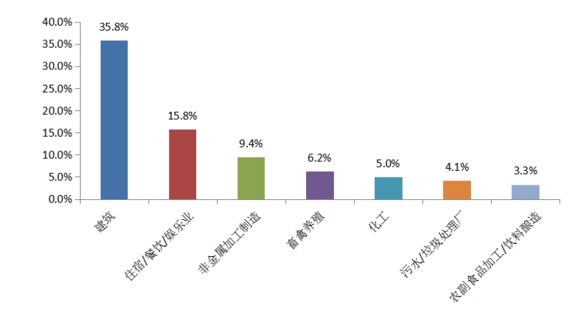 從行業(yè)類型來看,12月公眾反映最集中的行業(yè)為建筑業(yè),占35.8%;其次為住宿餐飲娛樂業(yè)和非金屬加工制造業(yè),分別占15.8%和9.4%。其中,建筑業(yè)占比比11月同類占比下降2.5%;住宿餐飲娛樂業(yè)舉報占比比11月同類占比下降0.2%,非金屬加工制造業(yè)舉報占比與11月同類占比下降1.3%。