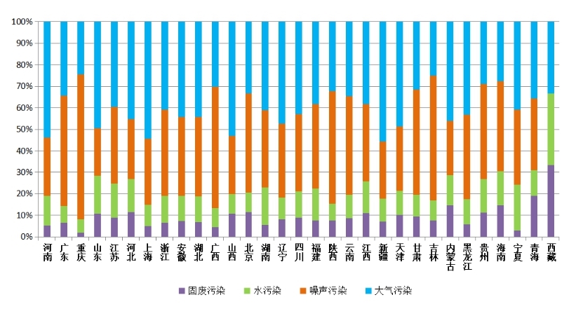 從各地區(qū)舉報污染類型占比看,上海、河南大氣污染舉報占比較高,超過全國平均水平約11個百分點,上海主要反映工業(yè)廢氣和油煙問題,河南主要反映煙粉塵和惡臭異味問題。重慶、廣西噪聲污染舉報占比較高,超過全國平均水平約18個百分點,重慶主要反映建設(shè)施工噪聲污染問題,廣西主要反映工業(yè)噪聲污染問題。山東、湖南水污染舉報占比超過全國平均水平約6個百分點,主要反映工業(yè)廢水和生活廢水污染問題。