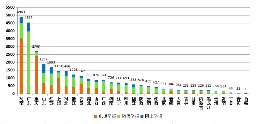 從各地區(qū)不同渠道舉報數(shù)量看,河南、廣東、重慶等地舉報總量居前列,河南、重慶、上海等地電話舉報占比較高,廣東、河南、江蘇等地微信舉報占比較高。