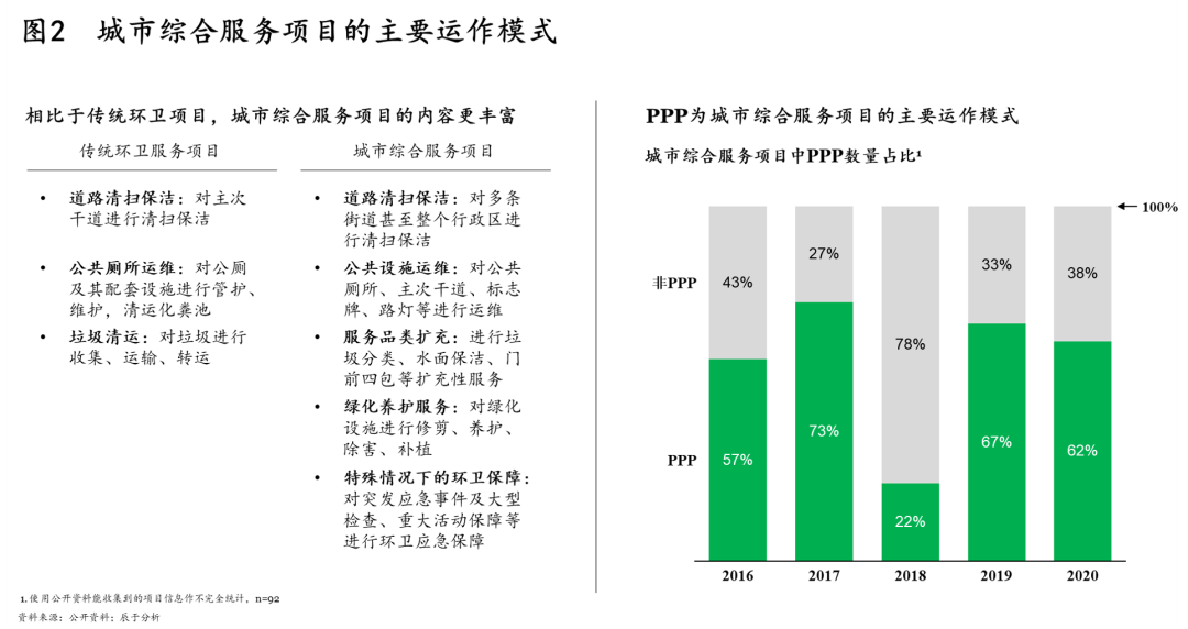 其二,PPP模式的采用,利用社會資本解決環(huán)衛(wèi)一體化項目的資金難題成為可能。相比于傳統(tǒng)環(huán)衛(wèi)項目,城市綜合服務項目的內(nèi)容更為豐富,對資金的要求也相應提升,PPP模式的應用為有效盤活現(xiàn)有環(huán)衛(wèi)資產(chǎn)提供思路,其也成為城市綜合服務項目的主要運作模式,催生新一批的環(huán)衛(wèi)大單(如圖2)。