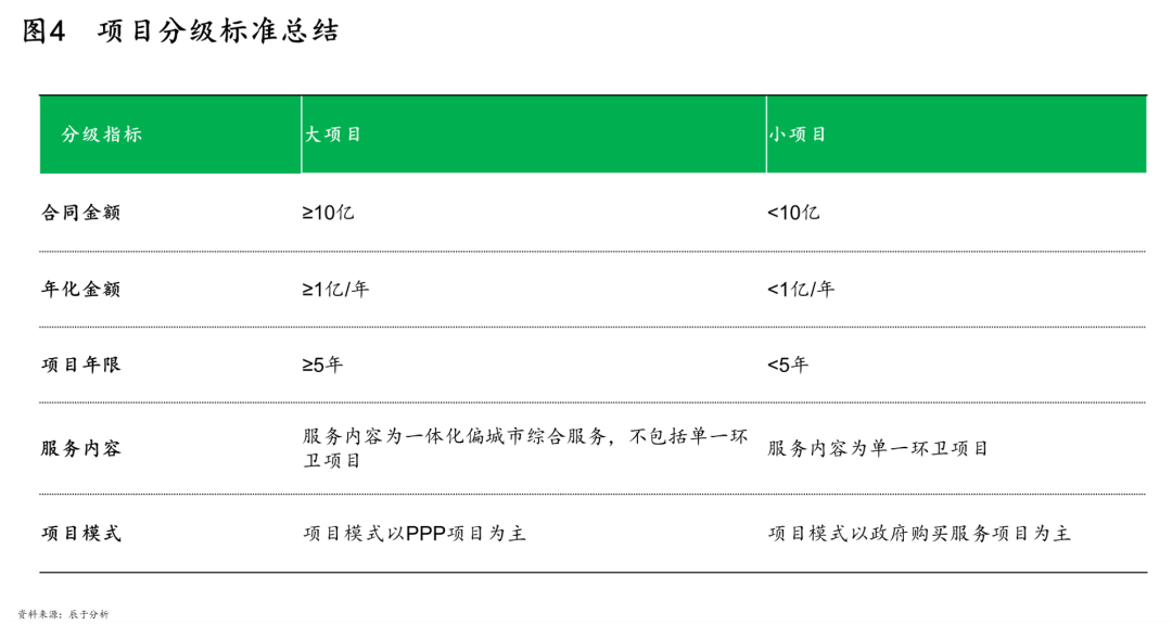 基于已有項目數(shù)據(jù),辰于從合同金額、年化金額、項目年限、服務內(nèi)容、項目模式這五個分級標準對“大項目”進行界定區(qū)分(如圖4)。一般而言,滿足以下條件之一的環(huán)衛(wèi)項目即可稱為“大項目”:合同金額在10億以上;年化金額在1億以上;合作年限在5年以上。