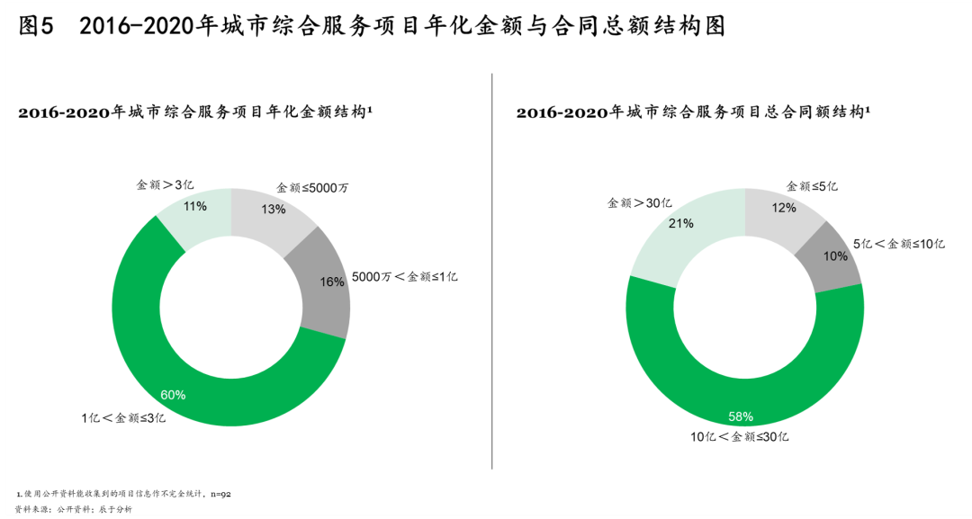 這類項目有助于企業(yè)快速形成規(guī)模與優(yōu)勢,是環(huán)衛(wèi)企業(yè)制勝未來的首要選擇。從2016-2020年城市綜合服務項目年化金額及合同總額結(jié)構(gòu)圖中可以看出,大項目的年化金額與合同總額均占7成以上,因此相比爭奪數(shù)量多但金額少的小項目,獲得大項目對企業(yè)增收的意義更為突出(如圖5)。