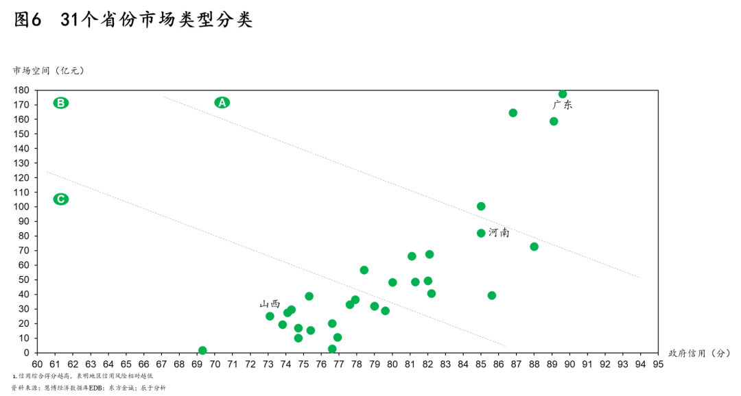 環(huán)衛(wèi)大單的產(chǎn)生不僅需要足夠的市場空間,而且需要當?shù)卣休^強的財政支付能力,辰于采用市場空間和政府信用雙維度分析,建立以環(huán)衛(wèi)大單為目標的區(qū)域評估模型(如圖6)。其中,東部省份(如廣東等)市場空間大,足以孕育出足夠的大金額項目,且政府信用相對較好,財政支付能力強,債務風險低。關(guān)注大單的企業(yè)可以在該類地區(qū)多拿項目,并與政府保持密切的溝通和聯(lián)系,通過集群效應、中心輻射效應,與政府合力催生出大項目。