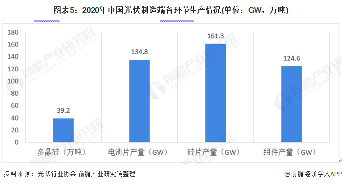 2020年我國(guó)光伏制造端中國(guó)多晶硅產(chǎn)量為39.2萬噸,電池片產(chǎn)量為134.8GW,硅片產(chǎn)量為161.3GW,組件產(chǎn)量為124.6萬噸。