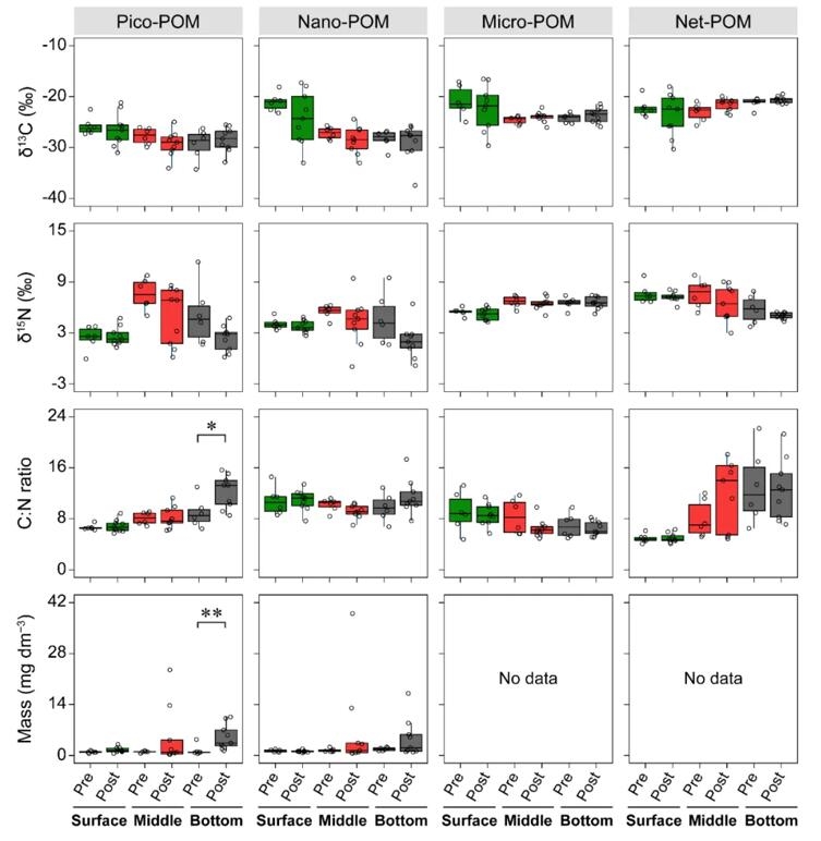 圖2 臺風(fēng)前后顆粒有機(jī)物碳氮同位素、化學(xué)計(jì)量和質(zhì)量的變化