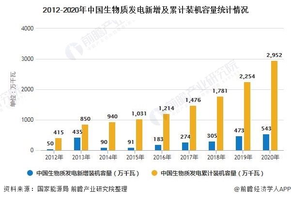截止2020年底,中國生物質(zhì)發(fā)電新增裝機達到543萬千瓦,累計裝機達到2952萬千瓦,同比增長22.6%;生物質(zhì)發(fā)電量達到1326億千瓦時,同比增長19.4%,繼續(xù)保持穩(wěn)步增長勢頭。