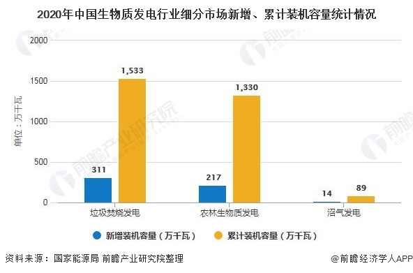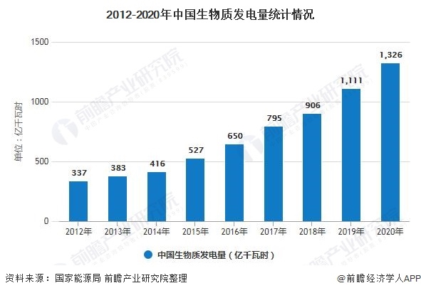 發(fā)電量方面:2020年中國生物質(zhì)發(fā)電達到1326億千瓦時,其中垃圾焚燒發(fā)電量778億千瓦時,農(nóng)林生物質(zhì)發(fā)電510億千瓦時,沼氣發(fā)電37.8億千瓦時。