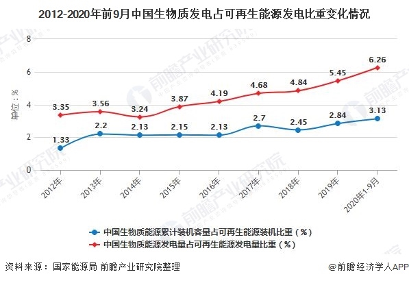 2020年三季度,生物質(zhì)能源累計裝機容量和發(fā)電量占可再生能源裝機和發(fā)電量的比重分別為3.13%和6.26%,比重持續(xù)提升。生物質(zhì)能發(fā)電的地位不斷上升,反映生物質(zhì)能發(fā)電正逐漸成為我國可再生能源利用中的新生力量。