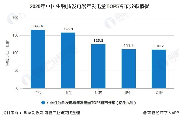 2020年年發(fā)電量排名前五位的省份是廣東、山東、江蘇、浙江和安徽,分別為166.4億千瓦時、158.9億千瓦時、125.5億千瓦時、111.4億千瓦時和110.7億千瓦時。我國生物質(zhì)能發(fā)電區(qū)域發(fā)展集中度較高。
