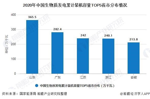 隨著生物質(zhì)能源開發(fā)和利用的政策落實和技術(shù)進步,各個區(qū)域在生物質(zhì)能源發(fā)展上也取得了一定的成績。具體來看,截至2020年底,累計裝機排名前五位的省份是山東、廣東、江蘇、浙江和安徽,分別為365.5萬千瓦、282.4萬千瓦、242.0萬千瓦、240.1萬千瓦和213.8萬千瓦。
