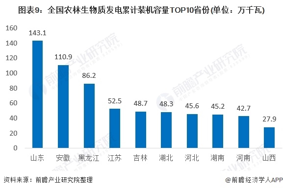 具體來看省份來看,2018年農(nóng)林生物質(zhì)發(fā)電累計裝機量TOP5地區(qū)為山東、安徽、黑龍江、江蘇、吉林,累計裝機量分別為143.1、110.9、86.2、52.5、48.7萬千瓦;發(fā)電量TOP5地區(qū)為山東、安徽、黑龍江、江蘇、河北,發(fā)電量分別為81.4、49.0、47.5、31.2、26.5億千瓦時。