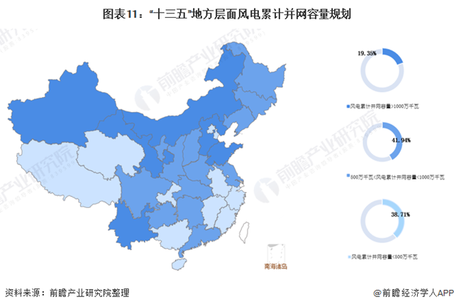 在地方層面,在“十三五”期間,全國各地區(qū)均對風(fēng)電場發(fā)展進(jìn)行了規(guī)劃,第一梯隊是風(fēng)電累計并網(wǎng)容量在1000萬千瓦以上的包括內(nèi)蒙古、河北省、新疆維吾爾自治區(qū)(含兵團(tuán))、甘肅省、云南省和山東省6個省區(qū)市,共占比19.35%;其中內(nèi)蒙古以風(fēng)電累計并網(wǎng)容量2700萬千瓦的規(guī)劃排名首位。