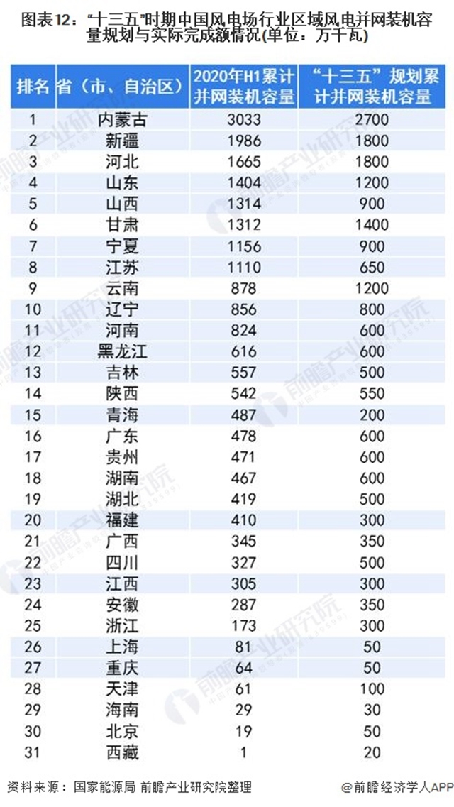 在實際的建設(shè)發(fā)展中,截止2020年上半年,全國大多數(shù)省(市、自治區(qū))已經(jīng)提前超額完成了“十三五”的規(guī)劃任務(wù),如內(nèi)蒙古累計并網(wǎng)裝機(jī)容量達(dá)到了3033萬千瓦,遠(yuǎn)超規(guī)劃累計并網(wǎng)裝機(jī)容量(2700萬千瓦)333萬千瓦;新疆實際累計并網(wǎng)裝機(jī)容量超過規(guī)劃的186萬千瓦;山東實際累計并網(wǎng)裝機(jī)容量超過規(guī)劃的204萬千瓦。
