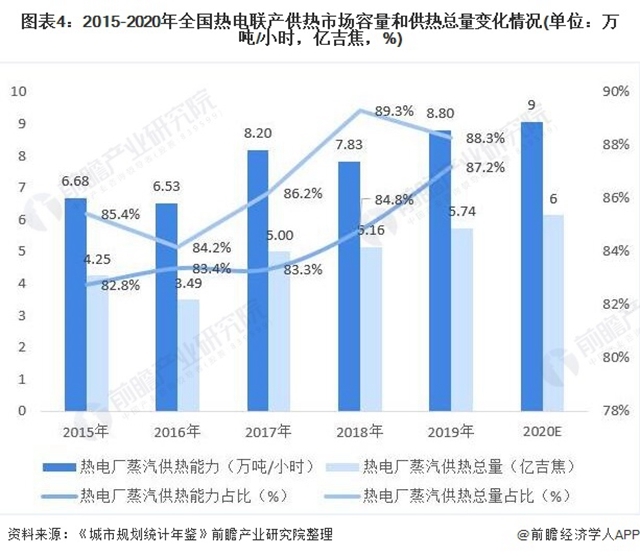 2019年,中國熱電廠蒸汽供熱總量達(dá)到5.74億吉焦,占全部蒸汽供熱總量的88.3%,初步估計(jì)2020年為6億吉焦。