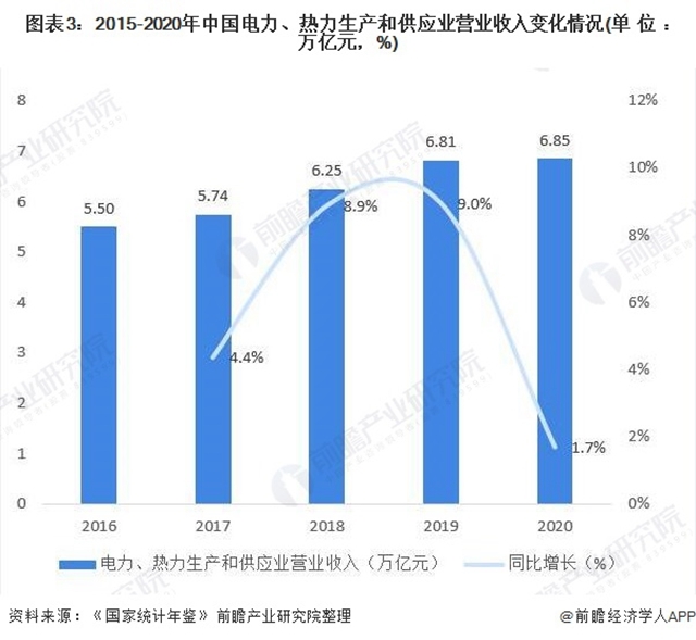 除了國家與地方政策推動(dòng)熱電聯(lián)產(chǎn)發(fā)展,工業(yè)、人口、城市化發(fā)展帶動(dòng)社會(huì)用電、用熱需求增長也推動(dòng)熱電聯(lián)產(chǎn)發(fā)展。2015-2020年中國電力、熱力生產(chǎn)和供應(yīng)業(yè)營業(yè)收入持續(xù)增長。2020年,隨著疫情得到有效控制以及國家逆周期調(diào)控政策逐步落地,復(fù)工復(fù)產(chǎn)、復(fù)商復(fù)市持續(xù)取得明顯成效,社會(huì)用電、用熱穩(wěn)定恢復(fù)。2020年中國電力、熱力生產(chǎn)和供應(yīng)業(yè)營業(yè)收入達(dá)6.85萬億元,同比增長1.7%,社會(huì)用電、用熱需求增長。