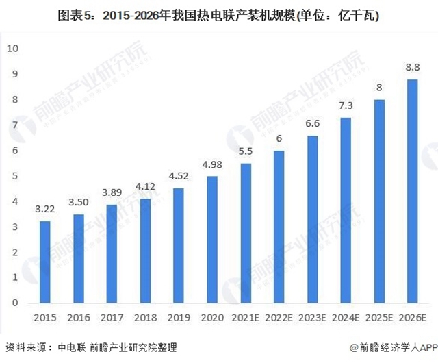 從中長期看,我國未來工業(yè)和居民采暖熱力需求、電力需求仍將保持穩(wěn)定增長態(tài)勢(shì),有效促進(jìn)熱電聯(lián)產(chǎn)裝機(jī)發(fā)展,未來5年,前瞻預(yù)計(jì)我國熱電聯(lián)產(chǎn)裝機(jī)容量規(guī)模將以10%的年均復(fù)合增長率增長,到2026年,我國熱電聯(lián)產(chǎn)裝機(jī)容量規(guī)模將突破8億千瓦。