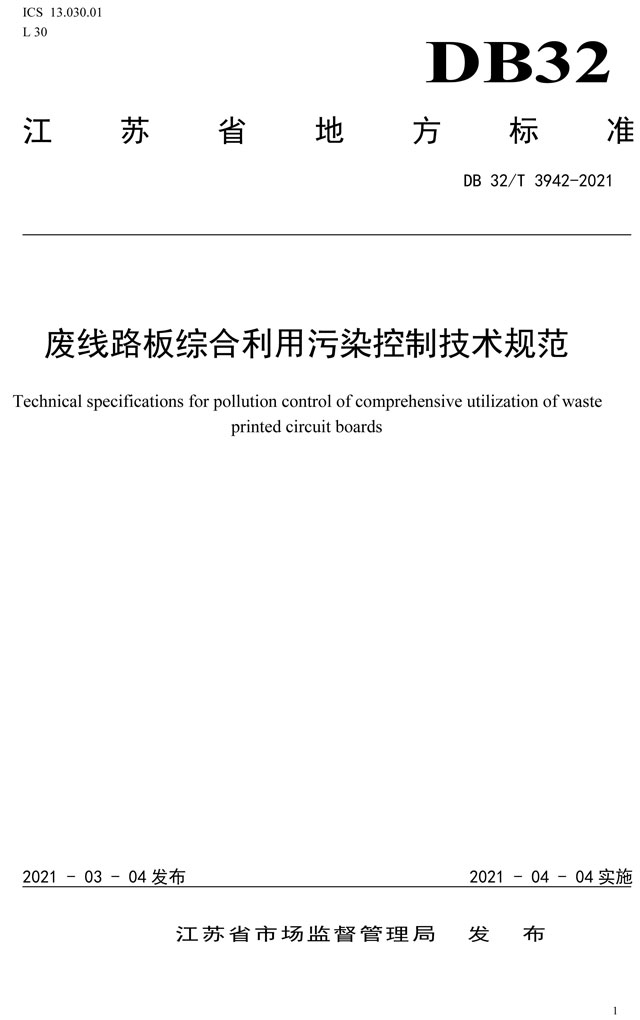 江蘇地方標(biāo)準(zhǔn):廢線(xiàn)路板綜合利用污染控制技術(shù)規(guī)范