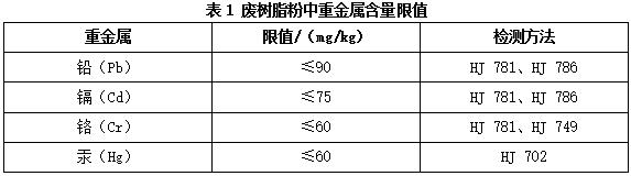 6.3.2.5企業(yè)應(yīng)對(duì)每批綜合利用的廢樹(shù)脂粉中重金屬的含量(如鉛、鎘、鉻、汞等)進(jìn)行檢測(cè),重金屬的限值與檢測(cè)方法按表1規(guī)定的執(zhí)行。利用廢樹(shù)脂粉生產(chǎn)建材的,再生產(chǎn)物除滿(mǎn)足國(guó)家、地方制定或行業(yè)通行的產(chǎn)品質(zhì)量標(biāo)準(zhǔn)外,其中有害物質(zhì)含量及浸出限值應(yīng)執(zhí)行HJ1091和GB 30760的要求。
