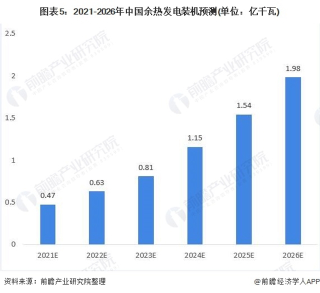 當(dāng)前,余熱發(fā)電裝機(jī)約占全國(guó)發(fā)電裝機(jī)的2%,“十四五”期間,高效節(jié)能技術(shù)的持續(xù)研發(fā)與突破將促使傳統(tǒng)生產(chǎn)過程升級(jí),余熱余壓利用等工業(yè)節(jié)能細(xì)分市場(chǎng)份額將進(jìn)一步擴(kuò)大,余熱發(fā)電裝機(jī)占全國(guó)發(fā)電裝機(jī)的比重也不斷擴(kuò)大,預(yù)計(jì)2026年全國(guó)余熱發(fā)電裝機(jī)接近2億千瓦。