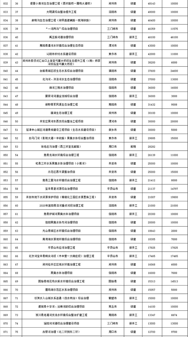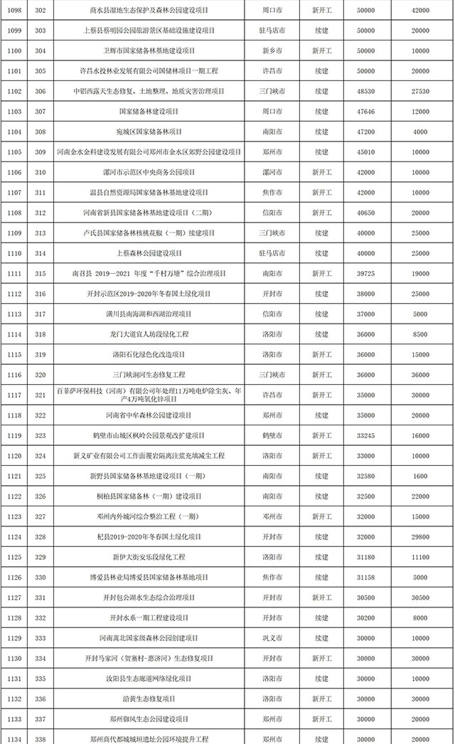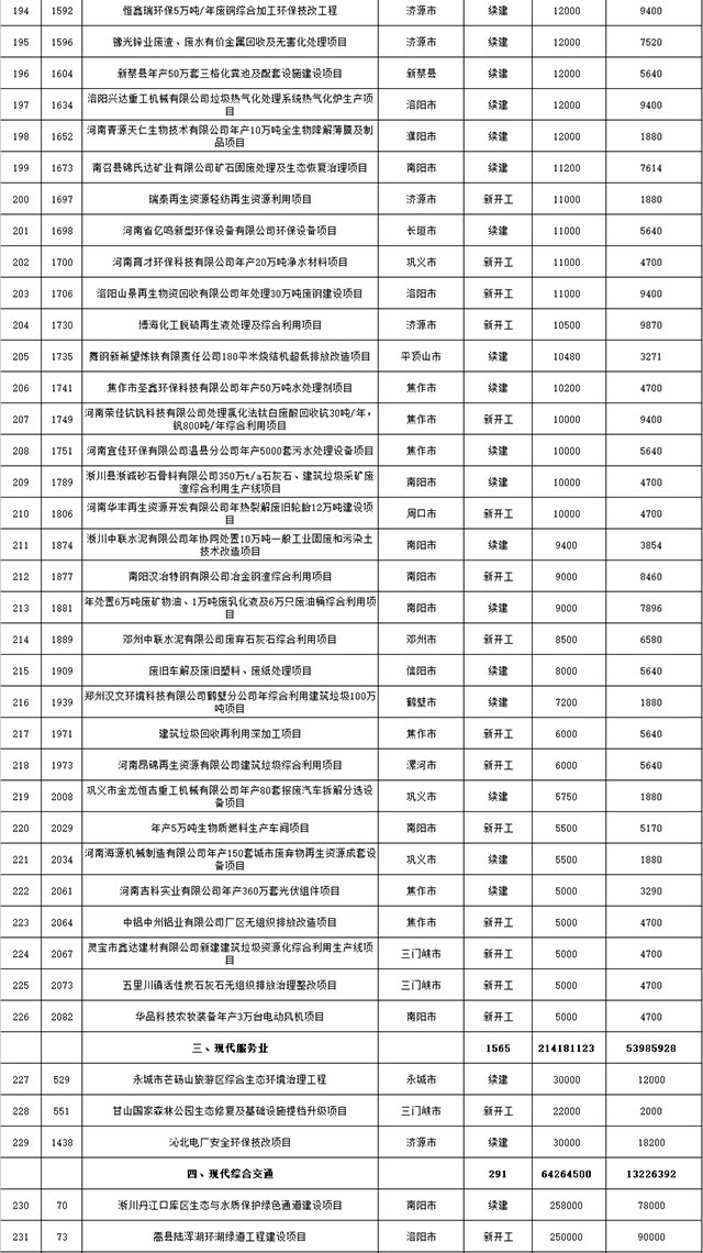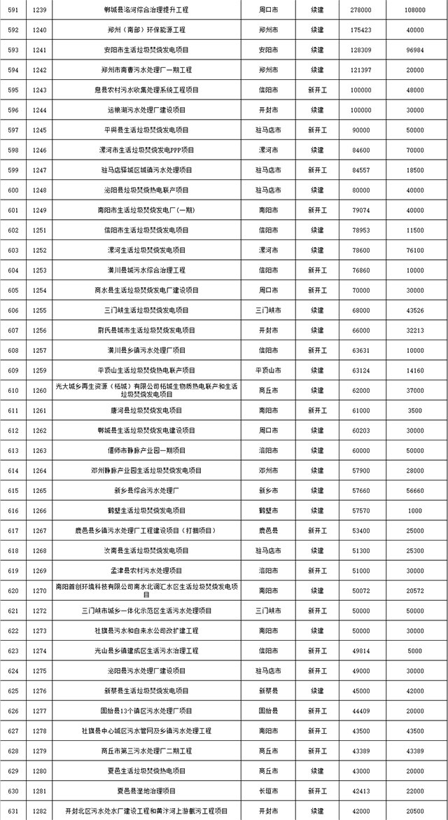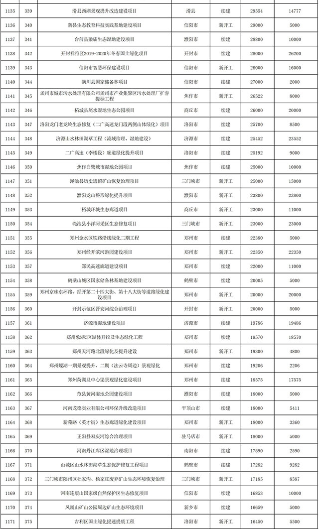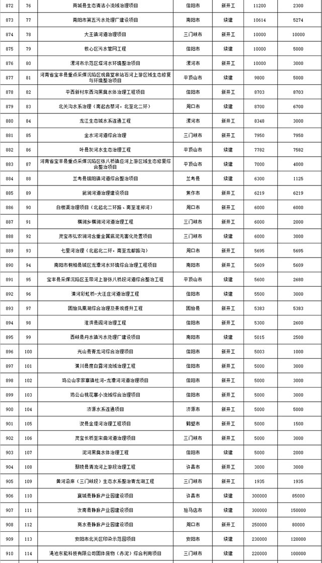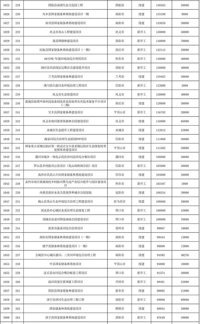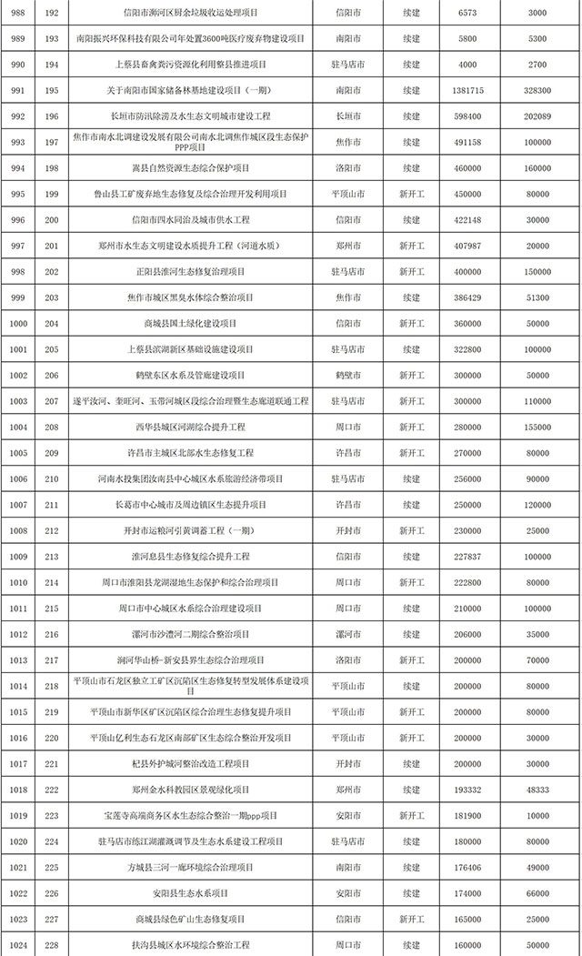 包括鄭州市賈魯河綜合治理生態(tài)綠化工程、潢川縣潢河三期治理項(xiàng)目、唐河縣桐河口生態(tài)水系修復(fù)工程(北辰二期)、周口中心城區(qū)水系綜合治理建設(shè)項(xiàng)目、泌陽(yáng)縣泌水河生態(tài)水系治理項(xiàng)目、潘河城區(qū)段生態(tài)環(huán)境綜合整治項(xiàng)目、確山縣宏聲建筑垃圾資源化再利用項(xiàng)目、寶豐縣廢棄礦山地質(zhì)生態(tài)環(huán)境修復(fù)與綜合治理項(xiàng)目、西華縣靜脈產(chǎn)業(yè)園建設(shè)項(xiàng)目、三門(mén)峽危險(xiǎn)廢物綜合處置中心建設(shè)項(xiàng)目、平輿縣建筑垃圾回收再利用建設(shè)項(xiàng)目、孟州市污泥和工業(yè)園固體廢物處理項(xiàng)目、許昌餐廚垃圾回收處理項(xiàng)目、平頂山市報(bào)廢汽車(chē)回收拆解項(xiàng)目、上蔡縣畜禽糞污資源化利用整縣推進(jìn)項(xiàng)目、焦作市城區(qū)黑臭水體綜合整治項(xiàng)目、信陽(yáng)市智慧環(huán)保建設(shè)項(xiàng)目、山城區(qū)山水林田湖草生態(tài)保護(hù)修復(fù)工程項(xiàng)目、鳳凰山礦山公園周邊礦山生態(tài)環(huán)境項(xiàng)目、山水林田湖草及沿黃生態(tài)環(huán)境綜合治理項(xiàng)目、澠池縣油煙監(jiān)控建設(shè)項(xiàng)目、羅山縣礦山地質(zhì)環(huán)境恢復(fù)與綜合治理項(xiàng)目等。