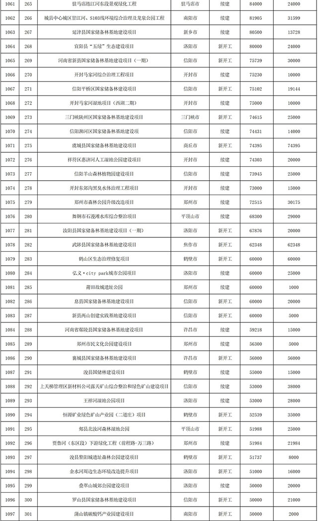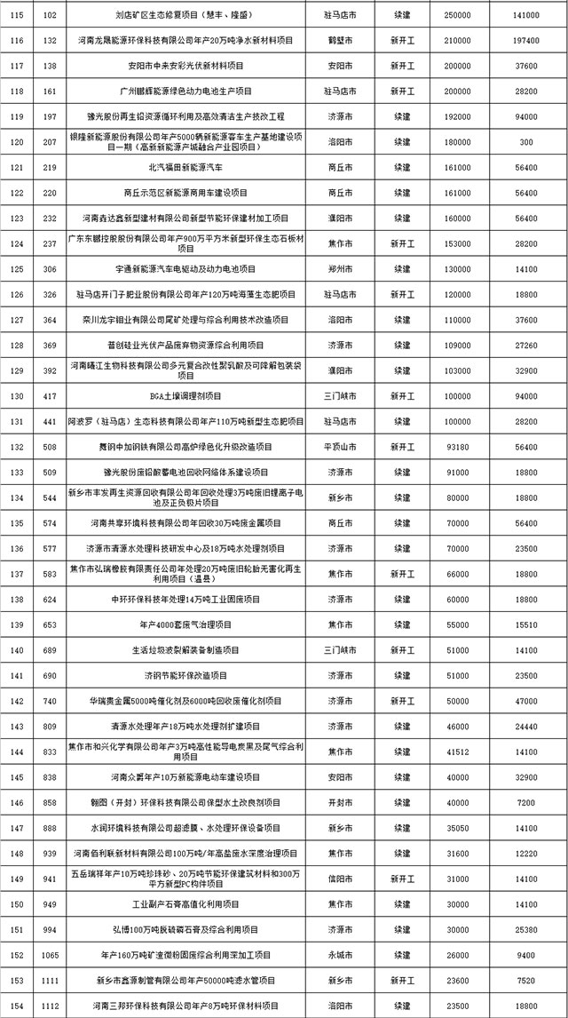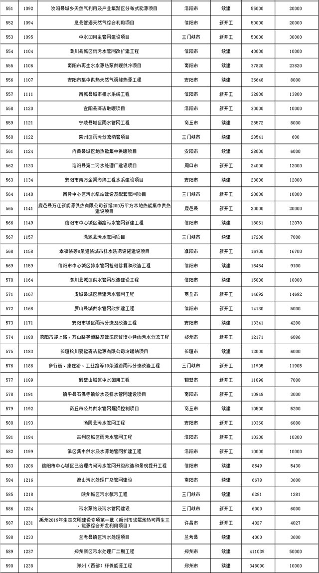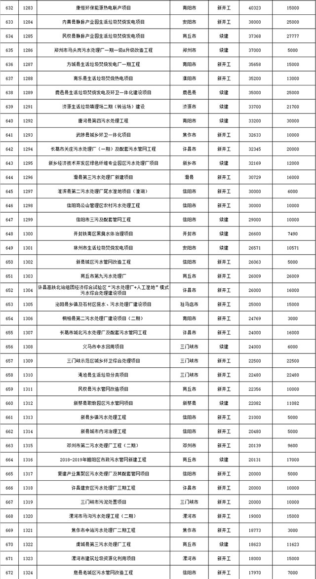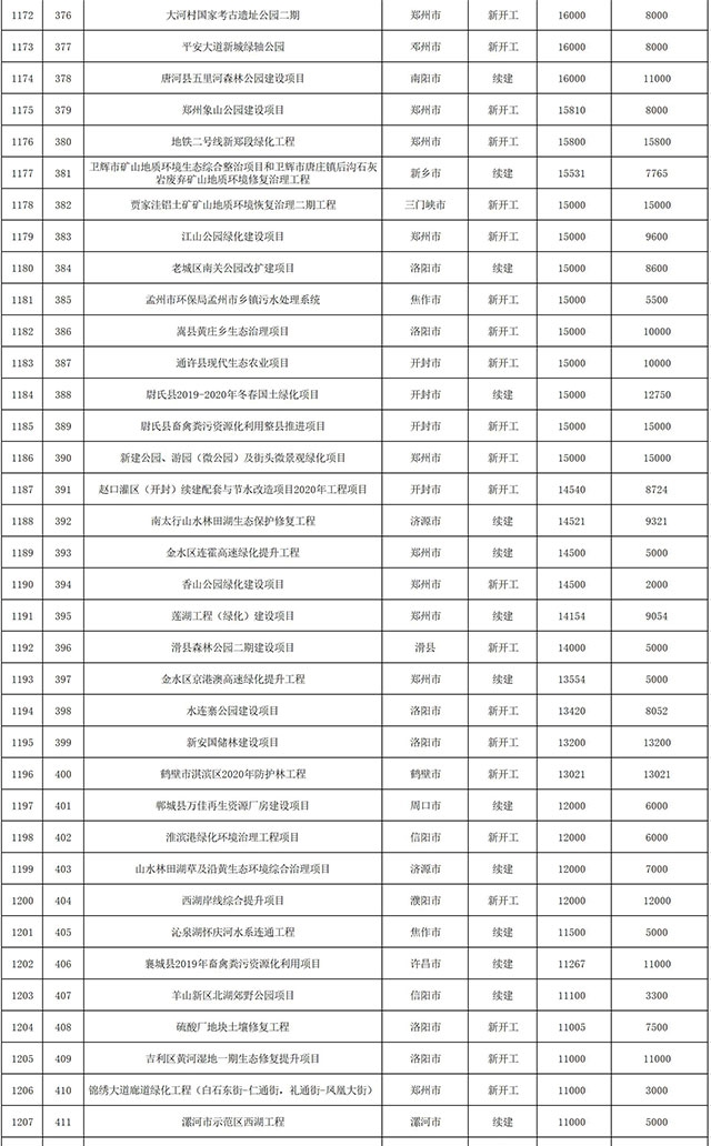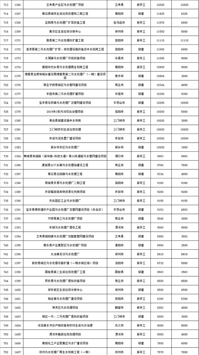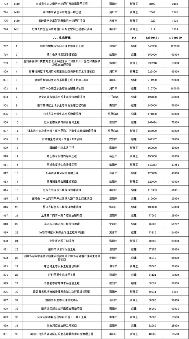 包括鄭州市賈魯河綜合治理生態(tài)綠化工程、潢川縣潢河三期治理項(xiàng)目、唐河縣桐河口生態(tài)水系修復(fù)工程(北辰二期)、周口中心城區(qū)水系綜合治理建設(shè)項(xiàng)目、泌陽(yáng)縣泌水河生態(tài)水系治理項(xiàng)目、潘河城區(qū)段生態(tài)環(huán)境綜合整治項(xiàng)目、確山縣宏聲建筑垃圾資源化再利用項(xiàng)目、寶豐縣廢棄礦山地質(zhì)生態(tài)環(huán)境修復(fù)與綜合治理項(xiàng)目、西華縣靜脈產(chǎn)業(yè)園建設(shè)項(xiàng)目、三門(mén)峽危險(xiǎn)廢物綜合處置中心建設(shè)項(xiàng)目、平輿縣建筑垃圾回收再利用建設(shè)項(xiàng)目、孟州市污泥和工業(yè)園固體廢物處理項(xiàng)目、許昌餐廚垃圾回收處理項(xiàng)目、平頂山市報(bào)廢汽車(chē)回收拆解項(xiàng)目、上蔡縣畜禽糞污資源化利用整縣推進(jìn)項(xiàng)目、焦作市城區(qū)黑臭水體綜合整治項(xiàng)目、信陽(yáng)市智慧環(huán)保建設(shè)項(xiàng)目、山城區(qū)山水林田湖草生態(tài)保護(hù)修復(fù)工程項(xiàng)目、鳳凰山礦山公園周邊礦山生態(tài)環(huán)境項(xiàng)目、山水林田湖草及沿黃生態(tài)環(huán)境綜合治理項(xiàng)目、澠池縣油煙監(jiān)控建設(shè)項(xiàng)目、羅山縣礦山地質(zhì)環(huán)境恢復(fù)與綜合治理項(xiàng)目等。