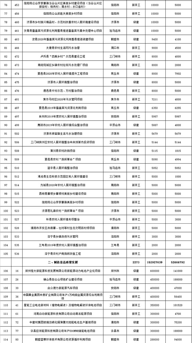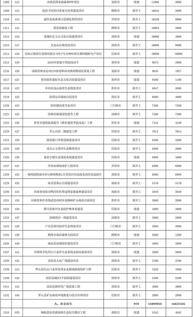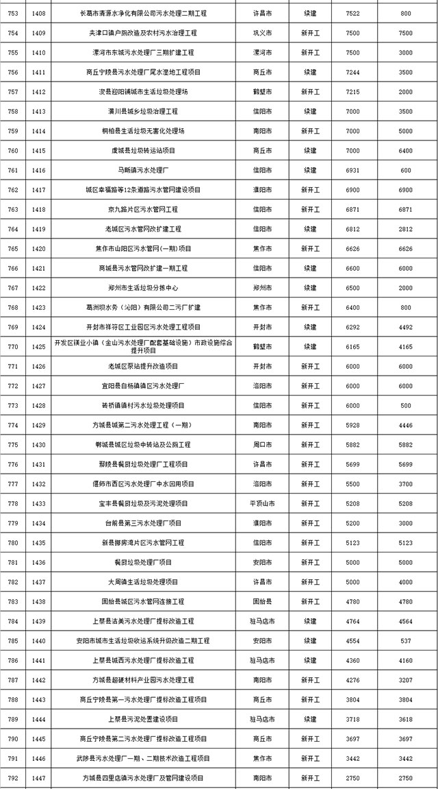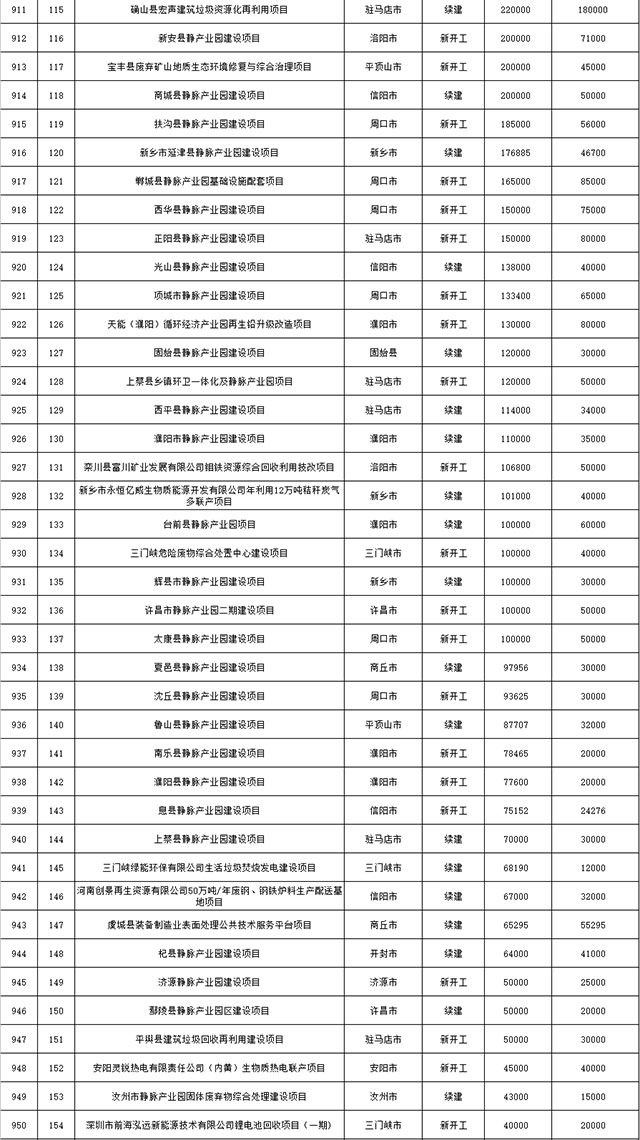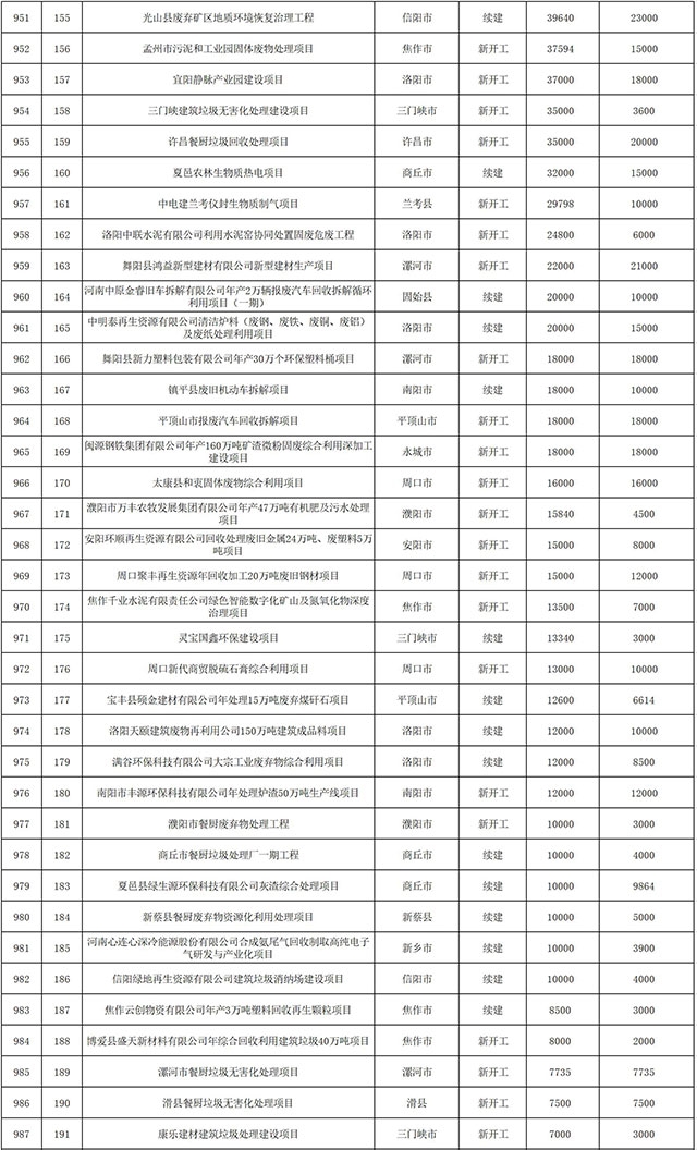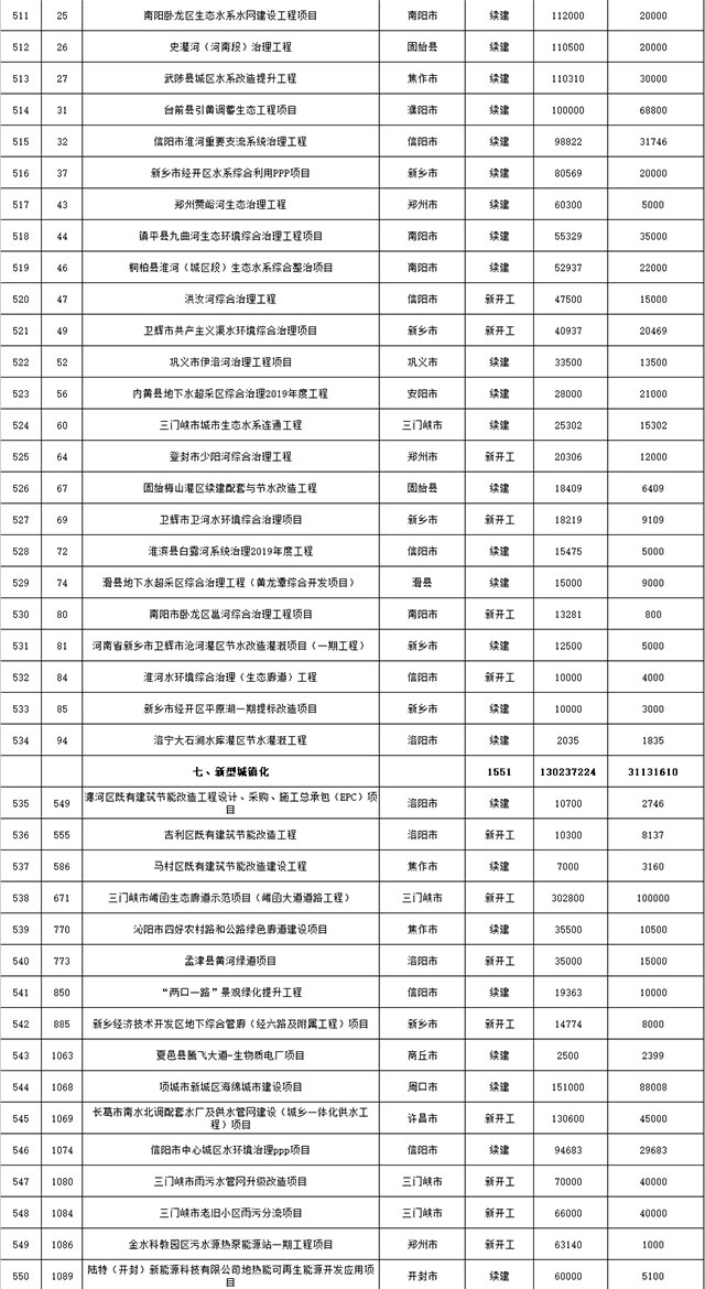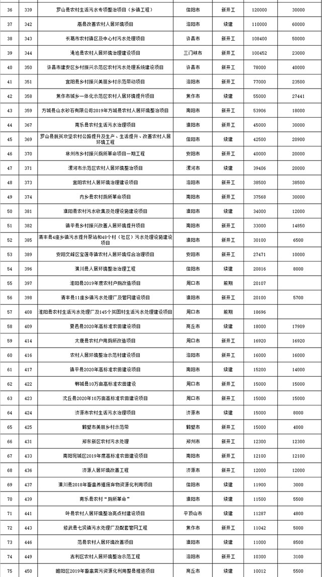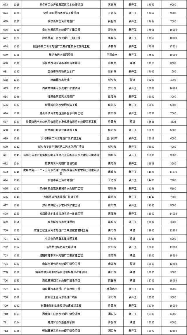 包括鄭州市賈魯河綜合治理生態(tài)綠化工程、潢川縣潢河三期治理項(xiàng)目、唐河縣桐河口生態(tài)水系修復(fù)工程(北辰二期)、周口中心城區(qū)水系綜合治理建設(shè)項(xiàng)目、泌陽(yáng)縣泌水河生態(tài)水系治理項(xiàng)目、潘河城區(qū)段生態(tài)環(huán)境綜合整治項(xiàng)目、確山縣宏聲建筑垃圾資源化再利用項(xiàng)目、寶豐縣廢棄礦山地質(zhì)生態(tài)環(huán)境修復(fù)與綜合治理項(xiàng)目、西華縣靜脈產(chǎn)業(yè)園建設(shè)項(xiàng)目、三門(mén)峽危險(xiǎn)廢物綜合處置中心建設(shè)項(xiàng)目、平輿縣建筑垃圾回收再利用建設(shè)項(xiàng)目、孟州市污泥和工業(yè)園固體廢物處理項(xiàng)目、許昌餐廚垃圾回收處理項(xiàng)目、平頂山市報(bào)廢汽車(chē)回收拆解項(xiàng)目、上蔡縣畜禽糞污資源化利用整縣推進(jìn)項(xiàng)目、焦作市城區(qū)黑臭水體綜合整治項(xiàng)目、信陽(yáng)市智慧環(huán)保建設(shè)項(xiàng)目、山城區(qū)山水林田湖草生態(tài)保護(hù)修復(fù)工程項(xiàng)目、鳳凰山礦山公園周邊礦山生態(tài)環(huán)境項(xiàng)目、山水林田湖草及沿黃生態(tài)環(huán)境綜合治理項(xiàng)目、澠池縣油煙監(jiān)控建設(shè)項(xiàng)目、羅山縣礦山地質(zhì)環(huán)境恢復(fù)與綜合治理項(xiàng)目等。