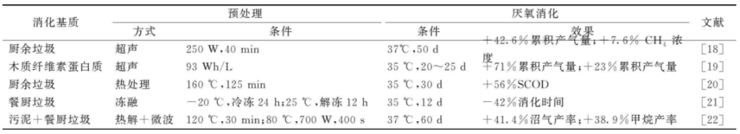 物理預(yù)處理方法包含超聲波、熱處理、凍融和微波處理等手段,相關(guān)研究見(jiàn)表1。超聲波的空化作用和水分子凍結(jié)的冰晶產(chǎn)生的機(jī)械作用使細(xì)胞壁破解,破壞細(xì)胞膜結(jié)構(gòu),使細(xì)胞內(nèi)有機(jī)物質(zhì)更多溶出,與水解酶充分接觸,增大水解效率,縮短消化時(shí)間。微波預(yù)處理與熱處理機(jī)理相似,利用電磁場(chǎng)的熱效應(yīng)加熱破壞細(xì)胞有機(jī)質(zhì)結(jié)構(gòu),但與傳統(tǒng)的熱處理方法相比,微波預(yù)處理加熱速度快、熱效率高、設(shè)備體積小。考慮處理效果的同時(shí),預(yù)處理成本與額外獲取的能源也是應(yīng)該重視的問(wèn)題。額外獲得能源和預(yù)處理投入相抵后,凍融預(yù)處理因無(wú)須添加化學(xué)藥品與低能量輸入,是具最高利潤(rùn)(10~15歐元/(t·kW))的預(yù)處理方法。近年來(lái),水熱預(yù)處理逐漸成為研究熱點(diǎn),具有更大的發(fā)展前景。水熱預(yù)處理不僅受溫度和停留時(shí)間的影響,還與壓力有關(guān)。由于水蒸氣容易獲得,很多工業(yè)生產(chǎn)過(guò)程都可能產(chǎn)生大量的水蒸氣且無(wú)法合理利用,所以水熱預(yù)處理的成本更低,并且能實(shí)現(xiàn)能量的循環(huán)。此外,荷蘭Sustec公司研發(fā)出的TurboTec熱水解工藝為連續(xù)流熱水解工藝,可將污泥熱水解后通過(guò)熱轉(zhuǎn)換器回收熱能,使熱水解預(yù)處理的熱能回收利用成為可能?,F(xiàn)有能源的利用和能量回收系統(tǒng)的研究,是實(shí)現(xiàn)處理效果與經(jīng)濟(jì)效益共贏的重要發(fā)展方向。表1 廚余垃圾物理預(yù)處理厭氧消化的相關(guān)研究