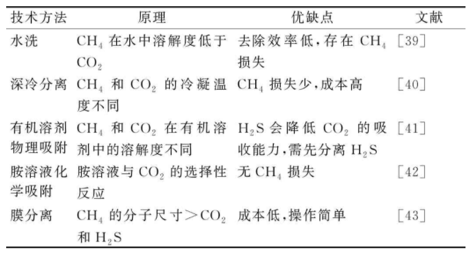 廚余垃圾厭氧消化的產(chǎn)物沼氣成分復(fù)雜,包括CH4、CO2、N2、H2S和硅氧烷等。其中:1)CO2含量越高,沼氣中的熱值越低;2)除甲烷外,沼氣中其他氣體是沼氣污染物。H2S和NH3具有極強(qiáng)的腐蝕性,燃燒后產(chǎn)生的SO2會(huì)破壞熱電聯(lián)產(chǎn)裝置和金屬部件。而硅氧烷,即使?jié)舛群苄?,但燃燒后產(chǎn)生的硅膠類(lèi)氧化物能殘留沉積在燃燒設(shè)備的引擎和閥門(mén)上造成故障。這些原因都會(huì)導(dǎo)致厭氧消化產(chǎn)生的沼氣不能直接利用,因此需要通過(guò)物理化學(xué)技術(shù)、生物技術(shù)等對(duì)產(chǎn)生的沼氣進(jìn)行凈化和升級(jí),以提高熱值,將其轉(zhuǎn)化為更高標(biāo)準(zhǔn)的燃料能源。常規(guī)的沼氣凈化升級(jí)方法總結(jié)見(jiàn)表2。