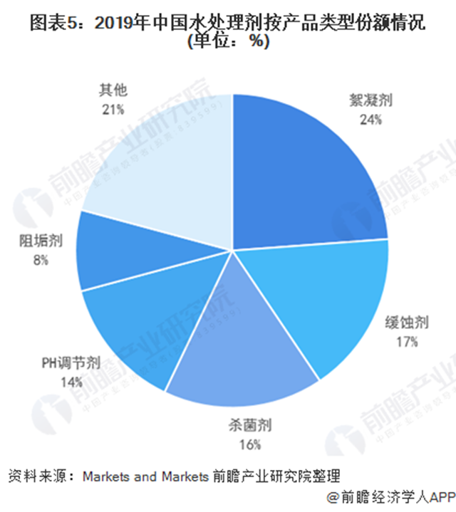 從水處理劑種類來看,絮凝劑、緩蝕劑和殺菌劑是市場規(guī)模較大的水處理劑種類,2019年我國水處理劑品種劃分的市場結(jié)構(gòu)中,絮凝劑的市場份額占比為24%、緩蝕劑的市場份額占比為17%;殺菌劑的市場份額占比為16%、pH調(diào)節(jié)劑的市場份額占比為14%、阻垢劑的市場份額占比為8%,前五名產(chǎn)品市場占比近80%。