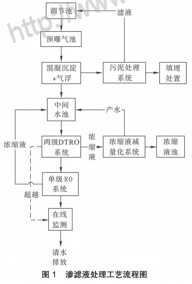 中間水池內滲濾液由泵提升進入兩級DTRO系統(tǒng)處理,兩級DTRO系統(tǒng)前設置了一套50um的 砂濾系統(tǒng)和一套10um的芯濾系統(tǒng),經(jīng)過兩級DTRO處理之后,產(chǎn)水經(jīng)過在線監(jiān)測系統(tǒng)達標排放,兩級DTRO濃縮液進入濃縮液減量化系統(tǒng)做減量處理, 濃縮液減量化系統(tǒng)的產(chǎn)水進入中間水池,再次進入兩級DTRO系統(tǒng)處理,濃縮液減量化系統(tǒng)的濃縮液排放到濃縮液池暫存。