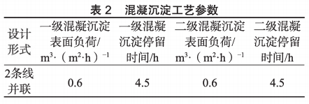預處理包含了曝氣改性、兩級混凝沉淀和混凝氣浮,混凝沉淀的主要工藝參數(shù),見表2。