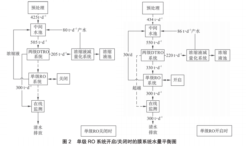 視兩級DTRO系統(tǒng)出水氨氮是否超標,選擇是否開啟單級RO系統(tǒng)。當兩級DTRO系統(tǒng)出水氨氮靖,關閉RO系統(tǒng)此時系竝體回收率為70.59%;當兩級DTRO出水氨氮值超標,開啟RO系統(tǒng),此 時系統(tǒng)整體回收率為69.12%。量平衡見圖2。