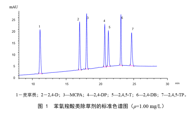在本標準規(guī)定的儀器參考條件(8.1)下,苯氧羧酸類除草劑的標準色譜圖見圖 1。