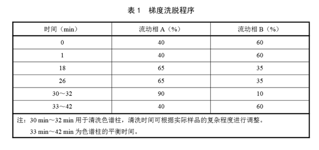 流動相 A:甲醇;流動相 B:磷酸水溶液(用磷酸調 pH=3.0±0.1);流速:0.5ml/min;柱溫: 30 ℃;檢測波長:230nm;進樣量:20.0μl。梯度洗脫程序見表 1。