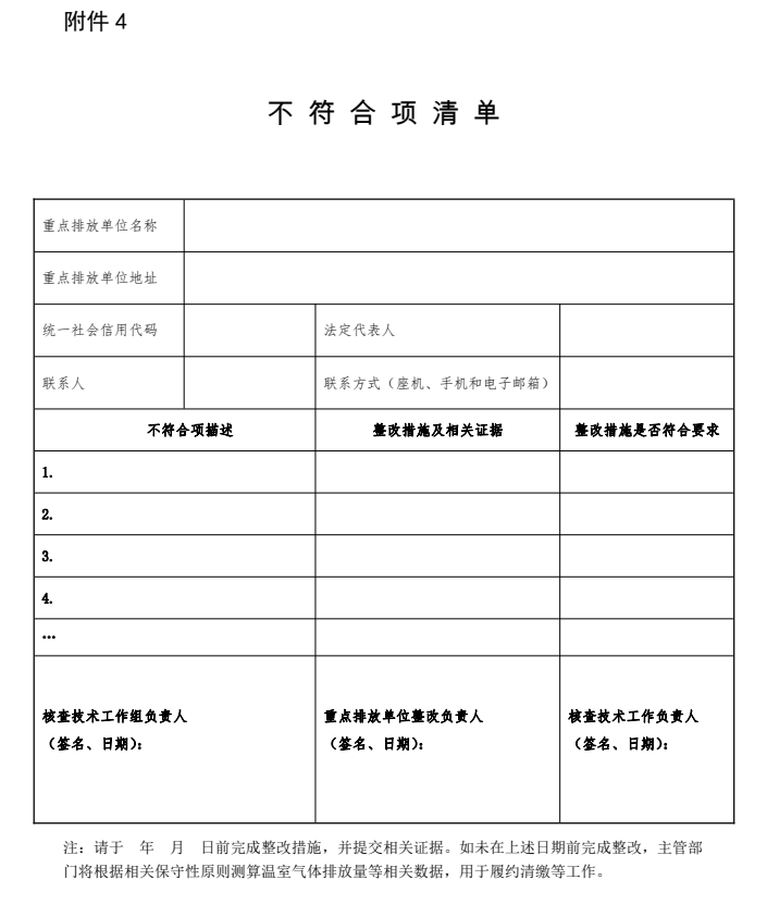 -對(duì)于提出不符合項(xiàng)的,技術(shù)工作組應(yīng)在收到重點(diǎn)排放單位提交的《不符合項(xiàng)清單》“整改措施及相關(guān)證據(jù)”一欄內(nèi)容后的5個(gè)工作日內(nèi)填寫(xiě)完成《核查結(jié)論》。