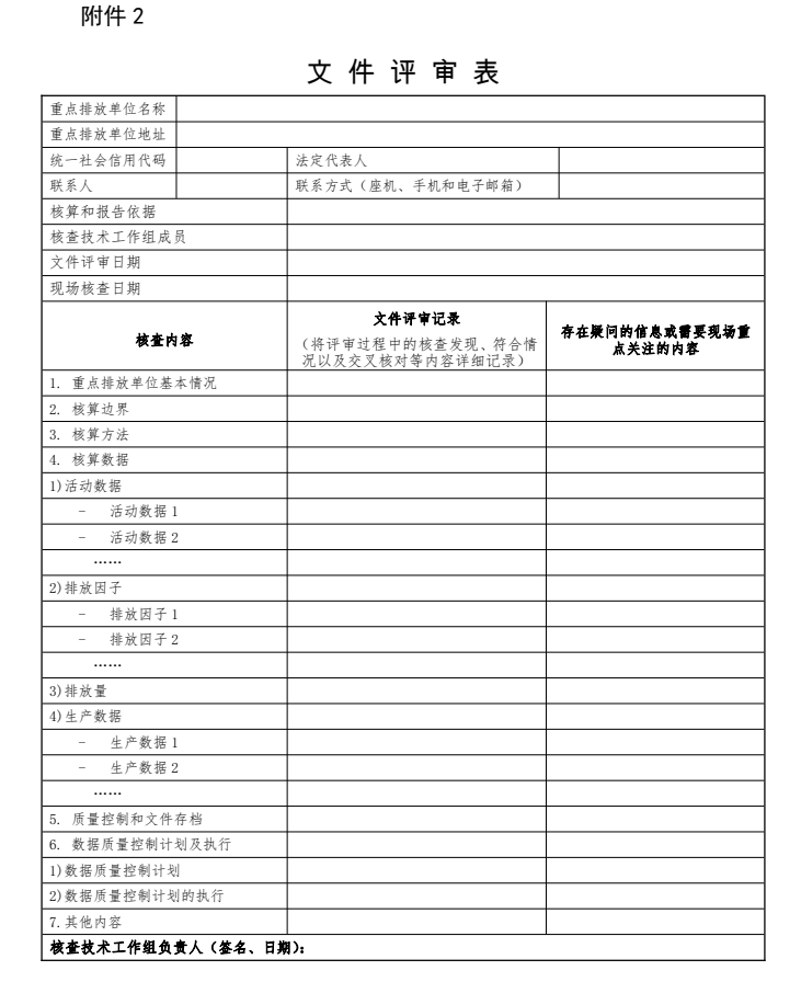 技術(shù)工作組應(yīng)根據(jù)相應(yīng)行業(yè)的溫室氣體排放核算方法與報(bào)告指南(以下簡(jiǎn)稱(chēng)核算指南)、相關(guān)技術(shù)規(guī)范,對(duì)重點(diǎn)排放單位提交的排放報(bào)告及數(shù)據(jù)質(zhì)量控制計(jì)劃等支撐材料進(jìn)行文件評(píng)審,初步確認(rèn)重點(diǎn)排放單位的溫室氣體排放量和相關(guān)信息的符合情況,識(shí)別現(xiàn)場(chǎng)核查重點(diǎn),提出現(xiàn)場(chǎng)核查時(shí)間、需訪問(wèn)的人員、需觀察的設(shè)施、設(shè)備或操作以及需查閱的支撐文件等現(xiàn)場(chǎng)核查要求,并按附件2和附件3的格式分別填寫(xiě)完成《文件評(píng)審表》和《現(xiàn)場(chǎng)核查清單》提交省級(jí)生態(tài)環(huán)境主管部門(mén)。